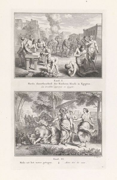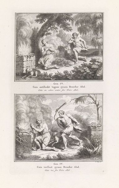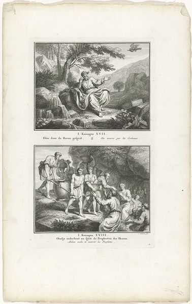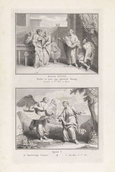 Curator: What a striking print! This engraving from 1791 by Jacob Folkema, held here at the Rijksmuseum, is titled "Elia gewekt door een engel en een officier wordt samen met vijftig soldaten door het vuur verteerd," depicting scenes from the story of Elijah. Editor: It's certainly dramatic! The stark contrast of light and shadow gives it an almost operatic feel. There's an immediate sense of divine intervention, juxtaposed against the chaos unfolding below. It calls to mind familiar dichotomies, not only of earthly and heavenly powers, but innocence and malevolence. Curator: Absolutely. Folkema masterfully uses Baroque visual tropes to explore the narrative art. The top scene illustrates the angel waking Elijah, while below we see the fiery destruction of the officer and his soldiers. The image as a whole conveys both care and vengeance, depending on who has favor in heaven. Editor: And those soldiers! The rendering of the officer and his retinue, so minutely detailed, adds a layer of the political into the image. You've got a story of faith but you also see how power resists moral influence and, ultimately, succumbs. Is the fire a symbol of divine retribution, or is it commentary about who gets to tell history? Curator: Well, consider the deeper resonance of fire throughout history. It's simultaneously purifying and destructive, evoking transformation across cultures. It could be a metaphor for religious and political upheavals of the time, suggesting how old structures can be burned away. It serves to reinforce the power of belief—of devotion—versus mere militarism. Editor: It speaks, then, to a continuity of belief in images themselves, whether religious, cultural, or political. As a visual symbol, fire certainly connects to many periods. What makes this piece notable is that tension. There's the intimacy of the angel juxtaposed against that almost theatrical scene of conflagration, so it is also the private contrasted against the very public. Curator: Exactly. It encapsulates a moment of private solace followed by an explosive display of public power. Editor: Food for thought, even centuries later. This print is much more complex and less literal than I initially believed. Curator: Agreed. Hopefully, it prompts modern eyes to consider that art and religious symbols endure because they explore a multiplicity of human perspectives.