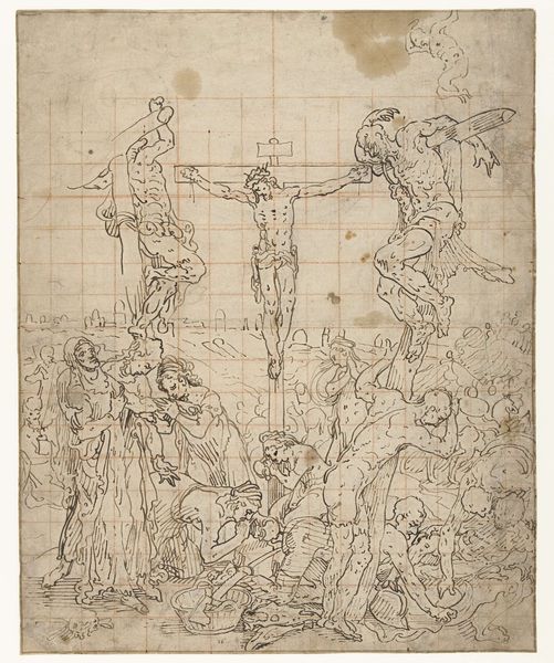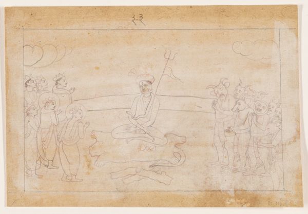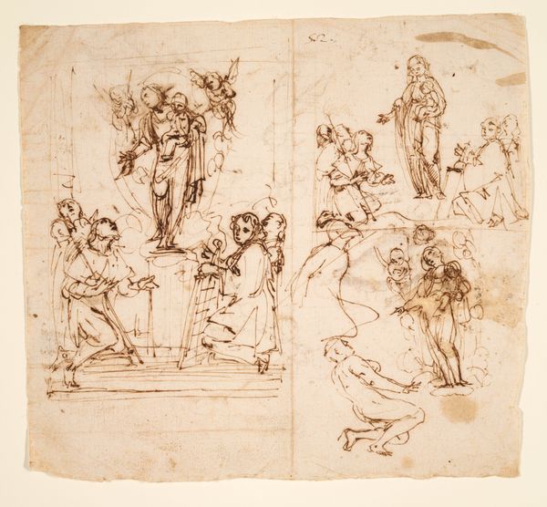 Curator: This drawing, tentatively dated to 1935, is titled "Ontwerptekening voor een communiediploma voor Norbertine Lammers," and it’s attributed to Leo Gestel. It’s rendered in pencil and pen on paper and resides here at the Rijksmuseum. Editor: It has a tender, dreamlike quality, wouldn’t you say? The soft pencil lines and floating figures give it such an ethereal feel. Curator: Absolutely. The composition, framing a central scene with floating angels and rural imagery, echoes a very specific visual language associated with religious and commemorative certificates of the era. It draws heavily on familiar symbols and imagery designed to convey both sanctity and personal connection to the young Norbertine Lammers on this important occasion. Editor: And the details really build this layered meaning. Note the juxtaposition of the kneeling figure next to what appears to be a village church with imagery of everyday life—houses, fields and animals. The floating angels act almost as guardians overlooking her pious moment, suggesting not just a sacredness to the communion but a connection to Norbertine’s whole world. What does this artwork tell us about the politics of the image? Curator: It reveals how the Catholic Church embedded its ideals in quotidian existence; it reveals both a grand, powerful church structure combined with more immediate, pastoral existence. These kinds of celebratory documents were carefully crafted to ensure a powerful message that reinforces specific social structures. It serves as an active means of social indoctrination through art. Editor: The lettering itself even carries meaning. The almost illuminated lettering that surrounds all sides recalls the most significant manuscripts throughout the Middle Ages. Even without understanding the text, this technique invokes deep traditions in Christian cultures. Curator: Precisely! Gestel employs recognizable artistic language as a strategy, thus underscoring not just religious but political and cultural ideals to specific populations. Editor: It makes you wonder what Norbertine Lammers thought when she first saw this design all those years ago. Did she recognize these symbols? Did the imagery speak to her faith, community, or social obligations? Curator: Those are vital questions, indeed! It helps me remember the profound role these certificates, though seemingly simple, played in structuring both private religious experience and broader communal values. Editor: Looking closer I am touched by the care and detail embedded within the entire artwork—Gestel’s work acts not just a historical relic but also as a powerful expression of an ongoing heritage of imagery, memory, and belief.