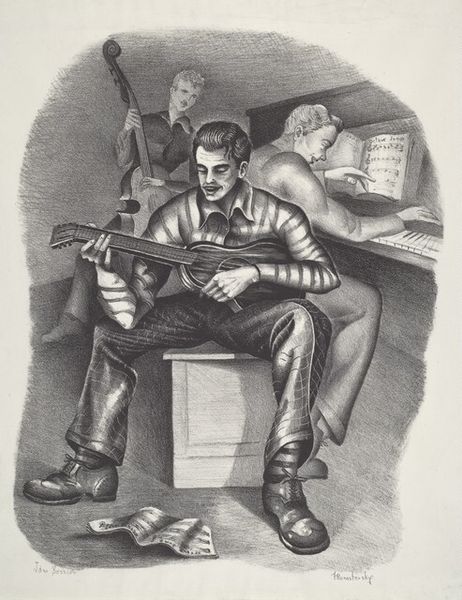 Theodore Roszak made "The Jailor" using lithography, and the way he's worked the stone is fascinating. The marks feel tender, almost tentative, like he’s feeling his way through the image. It's all about surface here. See how he builds up tone with these tiny, soft strokes? The texture is almost velvety, especially in the figure’s face. The stairs behind him lead nowhere but up, making the whole scene dreamlike. Look at how Roszak renders the playing cards. They seem to be more in focus than the face of the jailor himself, which makes me wonder, who is holding who captive? This reminds me a bit of Piranesi's etchings. He was also interested in creating impossible architectural spaces and playing with perspective. Art's like a conversation, right? We're all just riffing off each other, trying to make sense of the world in our own weird ways.