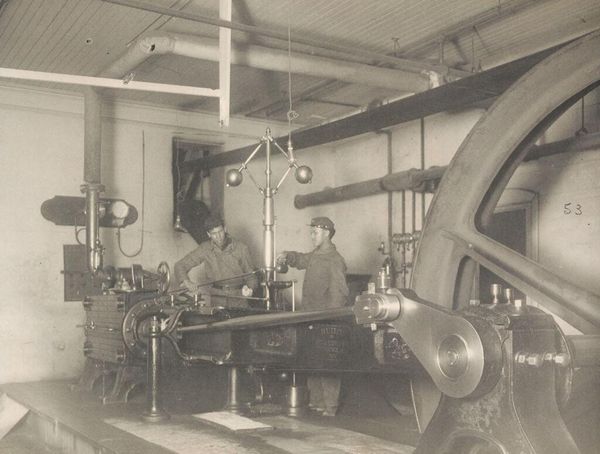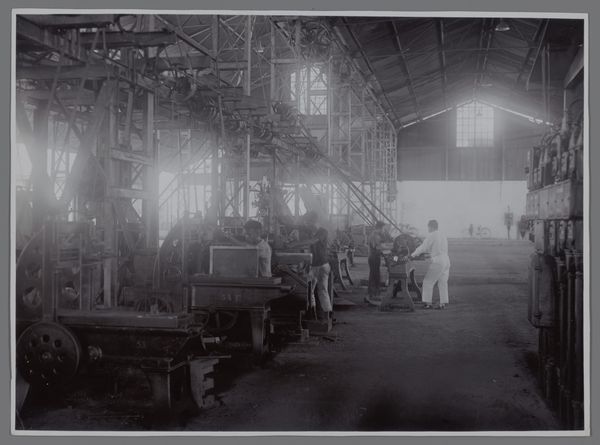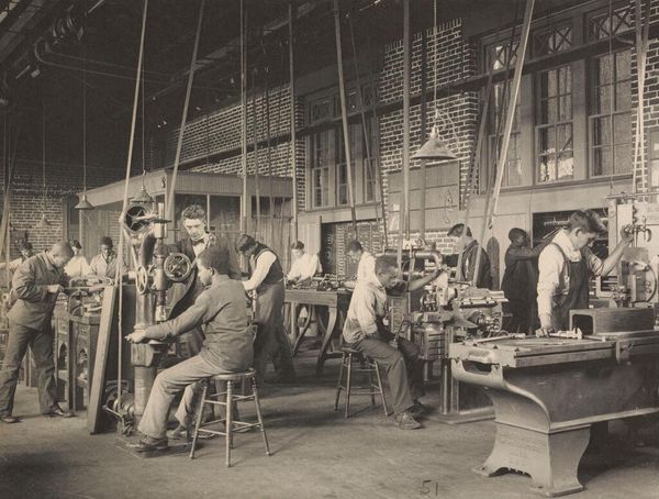 Editor: This is a black and white photograph by Frances Benjamin Johnston, taken at the Tuskegee Institute. It depicts a machine shop, and I’m struck by the sense of purpose in their faces, and also the heavy weight of the machinery. What do you see in this image? Curator: I see a record of a moment fraught with both promise and constraint, a visual document of the Tuskegee Institute’s mission. Look at the way the light falls. Does it feel like hope, or something more complicated? It speaks volumes about the era's complex ideas about education and opportunity for Black Americans. Editor: It's almost like the machines themselves are metaphors. Curator: Exactly! What do you make of the composition, the way Johnston frames these individuals? Does it feel balanced, staged, or authentic to you? Editor: I see what you mean. There's a sense of pride but also, perhaps, a pre-determined path. I hadn't thought of it that way before.