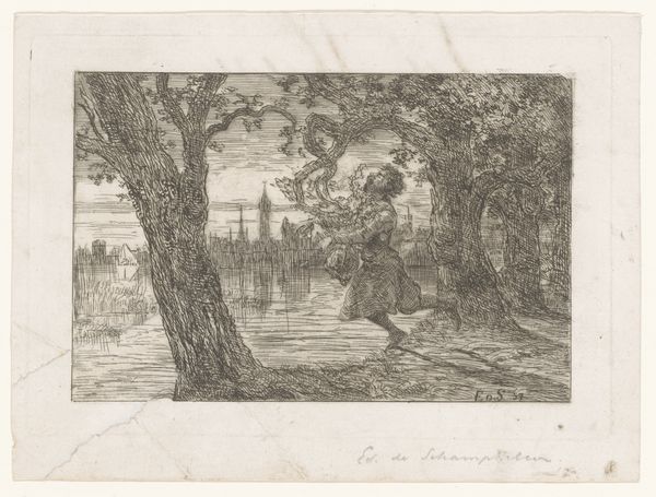 Carel Nicolaas Storm van 's-Gravesande created this etching called "Gezicht op Crooswijk" (View of Crooswijk). The delicate network of fine lines that define the image creates a muted and tranquil composition. The eye is drawn to the center where buildings meet the river. This composition, a study in contrasts, evokes the structuralist idea of binary oppositions. The orderly lines of the architecture contrast with the organic forms of the trees. The sky is loosely etched, which suggests an infinite, open space against the solid, grounded structures on the riverbanks. Notice the water, its calm surface reflecting the scene, blurring the distinction between the real and the reflected, the material and the ethereal. The artist plays with the concepts of inside versus outside, nature versus culture. These are mediated by the artist's hand. It invites us to consider how such juxtapositions shape our understanding of space and place. It is through these thoughtful arrangements of form that the artist prompts a deeper reflection.