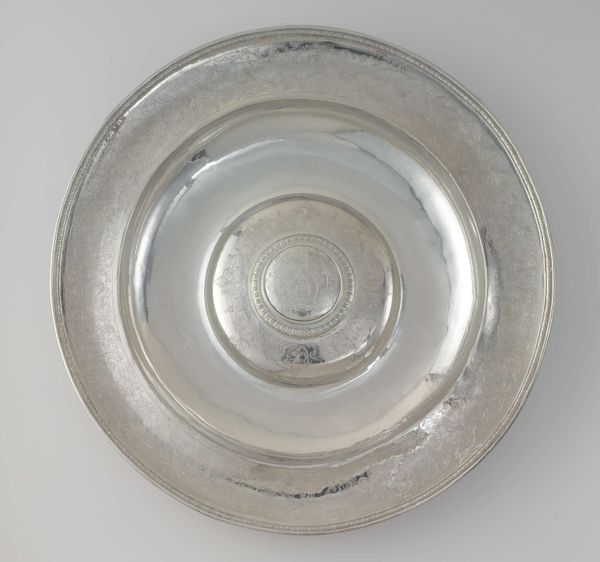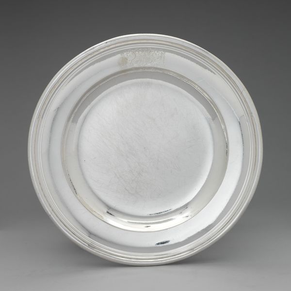 Editor: This is Samuel Edwards’ silver Baptismal Basin, made around 1756. Its simplicity almost feels modern, yet it speaks to Baroque craftsmanship. What symbolism can you unravel in this seemingly plain object? Curator: This isn’t just a basin; it's a vessel brimming with layered meanings. Water, in a religious context, always evokes cleansing, rebirth, and transformation. Given its intended purpose, it serves as a physical and symbolic container. Do you notice the inscription around the rim? Editor: Yes, I see it now. It must indicate the church or family it was made for. Curator: Exactly. It anchors the basin to a specific community, solidifying its cultural significance. The silversmith, Edwards, was creating more than just an object; he was contributing to the visual language of faith. Consider how light would have reflected from its polished surface, almost halo-like. Does that add to the imagery for you? Editor: Definitely. It brings in the divine through simple reflection. So, it’s about communal identity, faith, and artistry converging in one object. Curator: Precisely. It becomes a touchstone, a repository of cultural memory. Every baptism performed using this basin reinforces those connections. These objects accrue symbolic weight over time, linking generations through shared experience and visual vocabulary. What are your thoughts about that continuity? Editor: It's incredible to think of all the lives touched by this single basin and all that shared faith means. The object's journey, its function and beauty, is more profound than I initially grasped. Curator: Agreed, and by exploring its symbolism, we have breathed life into the object!