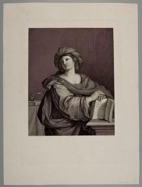 Curator: Domenico Cunego, who lived from 1726 to 1803, created this print called "Sibylla Hellespontiaca." Editor: It's fascinating how the etching technique creates such intricate textures, especially in the fabric and the figure's contemplative gaze. Curator: Cunego was known for his reproductive engravings, often recreating paintings. Considering the labor involved in such detailed work, how does this piece reflect the relationship between craft and art in the 18th century? Editor: It's intriguing to see the Sibyl, a figure historically associated with prophecy and power, rendered here. I wonder about the implications of depicting a woman in this role and how it intersects with the social constraints placed upon women during that era. Curator: Absolutely. The very act of reproducing and disseminating this image through printmaking democratizes access, allowing wider audiences to engage with classical themes and figures. Editor: Looking at it now, I appreciate how it offers a lens through which we can examine the intersections of gender, class, and artistic production in 18th-century Europe. Curator: I agree; understanding the means of its creation adds another layer to our appreciation.