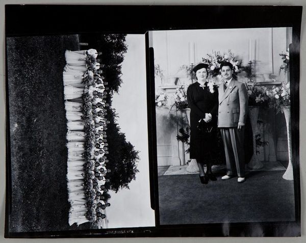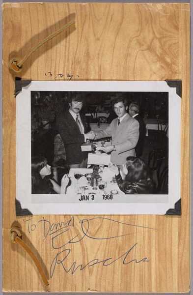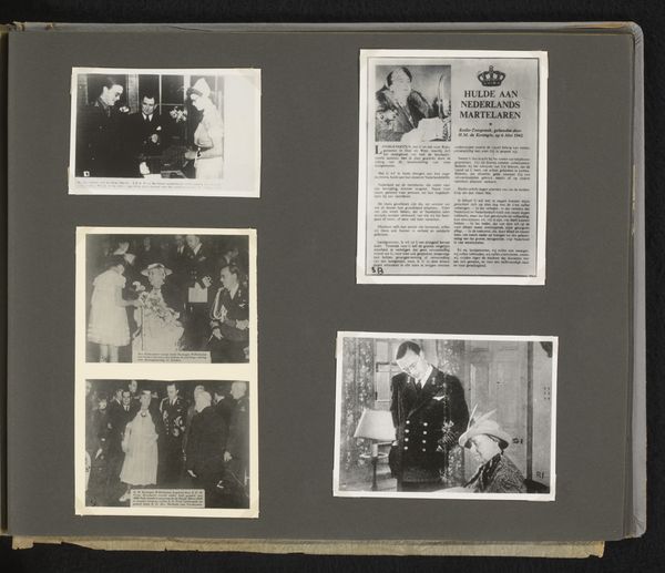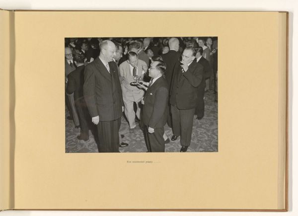 Curator: Let’s examine this photo album page, dating from between 1947 and 1955, during Isabel Wachenheimer's time at KLM in Israel. The images are gelatin silver prints depicting what appears to be a festive gathering. What are your initial thoughts? Editor: Stark, actually. Something about the tonal range, typical of gelatin-silver prints, heightens the rather formal, almost staged feeling, despite supposedly capturing a party. The social dynamics are certainly palpable, the division between groups clear. Curator: Indeed, there's a definite separation. Look at the top photo: Three men, one with a cigarette, locked in what appears to be intense discussion. While in the other image, several colleagues are observing two figures shaking hands. What can we surmise about the societal context around that moment? Editor: The prominence of men in suits indicates the gendered division of labour typical of the post-war era. We can speculate whether Wachenheimer, the photographer, had equal access within that sphere. The suits also connote authority, the corporatism of major companies like KLM, but who knows if they are really enjoying. Curator: What strikes me is the materiality itself. Gelatin silver prints are a direct result of photographic processes dependent on light-sensitive silver halides. Do you find the nature of these images – their existence as physical objects, to be an interesting point for observation? Editor: Absolutely. These are documents but also representations and products that help build an official version of corporate culture for a very influential company. Consider these celebrations of KLM staff as a form of state-building, a carefully assembled iconography of national progress. The photo-album as a form also serves as both historical testimony but it also becomes part of a construction kit to tell a specific narrative. Curator: A manufactured narrative, quite right. It makes me consider the work of the darkroom technician and the photographic printer: How much were these processes influenced by individual workers? And by broader technological standards around photography? Editor: These images exist in this photo-album as an artifact within specific socio-economic conditions, with gendered assumptions about how to tell the story of a company that had at its roots an important national symbol and endeavor. Curator: Considering those details adds considerable richness to our appreciation of these gelatin-silver prints beyond their surface representation. Editor: Agreed, and situates a small component, this album page, within broader discussions of corporate identity, labour practices, gender dynamics, and technological change in that moment in time.
