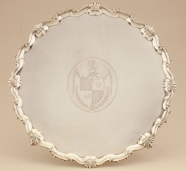 Editor: Here we have a piece called "Salver," or "Piring" in another language, made of silver and dated 1714. From what I can tell, it looks like an engraved commemorative plate. There's a distinct allegorical scene in the center that evokes a mood of somber remembrance. What story do you think it tells? Curator: It's a fascinating piece when you consider its place in 18th-century social practices. Plates like this weren’t merely decorative; they served a public function, solidifying social standing and commemorating significant life events, in this case, probably a death. Notice the allegorical scene depicting mortality with figures such as angels, cherubs, or the grim reaper surrounding a deceased person; this symbolism touches on societal views of life, death, and legacy at the time. Why do you think it was created using silver? Editor: That's an interesting question! Maybe silver, beyond its value, held a symbolic weight reflecting purity or remembrance during that era? How did these kinds of pieces function in relation to broader social norms or even political power? Curator: Precisely! Silver's intrinsic value made it an ideal material for projecting power and status. The display of wealth, often achieved through pieces such as this, could have influenced perception. More broadly, you must also examine this salver in relation to socio-political narratives. Commemorative objects frequently mirrored values upheld by institutions or social classes; that engraving could reinforce notions about morality or familial lineage favored in specific social strata at the time. Is there a phrase on it? Editor: It does appear to be inscribed, yes. Viewing this salver has helped me to start considering material objects less as "silent observers" but instead understanding their role within these powerful conversations between social classes. Curator: Absolutely, looking closer can give us the perspective to challenge those narratives.
