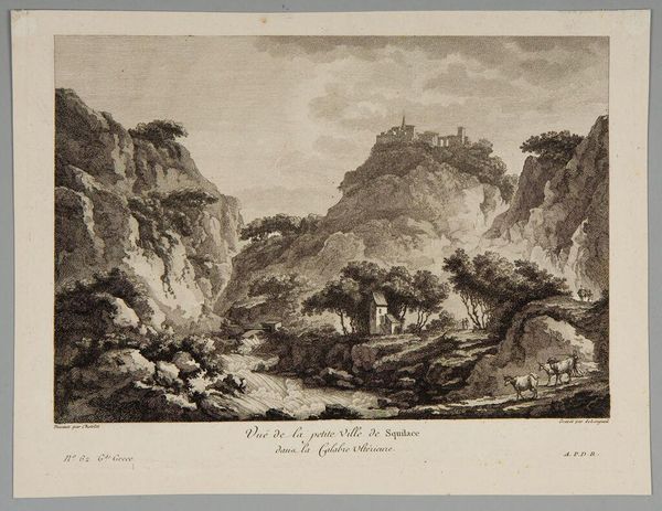 Curator: The sheer scale makes me feel insignificant. The peaks dwarf the figures in the foreground. Editor: This is William Woollett's "Great Frozen Valley near Chamouny in Savoy," housed here at the Harvard Art Museums. Woollett was an English engraver who died in 1785, so this work likely dates to the late 18th century. Curator: The mountains evoke a sense of timelessness. Their jagged edges, almost like teeth, suggest power and enduring strength. I feel a primal connection, a recognition of nature’s dominance. Editor: Landscapes such as this one became popular in Britain as the concept of "the sublime" took hold—the idea that nature could evoke feelings of awe and terror. Tourism and the rise of printmaking certainly played a role in circulating these images. Curator: I see the figures almost as symbols themselves – humanity venturing into the unknown, humbled by the immensity of the natural world. Editor: A fitting thought, given the way landscape painting helped shape national identity and aesthetic sensibilities. I leave with a renewed awareness of how art captures not just a place but an idea.