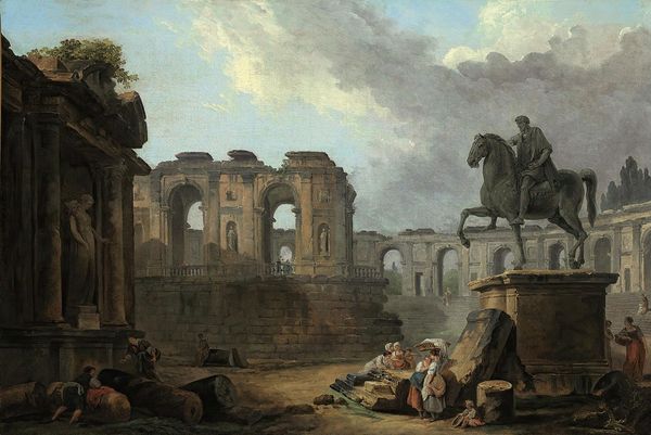Curator: Before us hangs Claude Lorrain's "Aeneas and Dido in Carthage," completed around 1675. It’s a gorgeous oil painting presently residing at the Kunsthalle Hamburg. Editor: Immediately, I'm struck by the overwhelming sense of impending doom. Even the luminous landscape can't mask the tension between these figures. Curator: Yes, there’s an almost theatrical arrangement to the characters, reminiscent of staged tableaux. Notice the prevalence of architectural features—they really emphasize themes of power and civilization. Lorrain consistently used the light to create depth, inviting the eye deeper into the scene, both literally and metaphorically. Editor: Definitely. And situating the narrative from Virgil's Aeneid within the backdrop of what looks like idealized Roman architecture… It's a complex commentary on colonialism and cultural exchange. Aeneas's "destiny," as it’s portrayed, is dependent upon the tragedy and exploitation of Dido. Look how isolated she appears from her people! Curator: You raise a powerful point. And consider the deer—it could represent Dido’s vulnerability or the hunt, a symbol linked with royalty but also mortality, reminding us of her fate and ultimately her suicide in the original story. Classical Roman dress serves to add gravitas. The light itself could symbolize divine will, almost preordained. Editor: Precisely. That’s precisely where my discomfort originates. This aesthetic beauty acts as a veneer for a complicated scene of betrayal and conquest, softening and somewhat obscuring its ethically fraught foundation. We should engage critically with those narratives now more than ever, I believe. Curator: I see what you mean; there are layers of complexity beneath this picturesque facade, both beautiful and troubling. Editor: It serves as a constant reminder to reflect critically on these historical images and question who truly profits from such supposedly “golden age” stories.