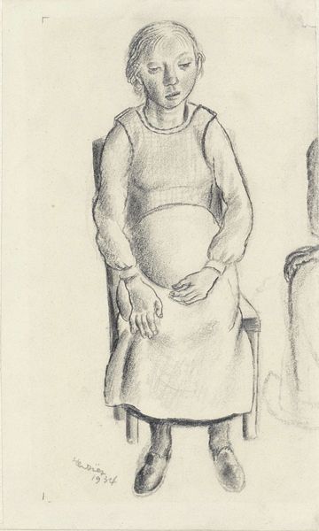 Henk Henriët made this drawing of a standing woman with an apron, using graphite on paper. You know, sometimes the simplest materials lead to the most evocative results. Here, the use of graphite allows for a delicate layering of tone, creating a soft, almost dreamlike atmosphere. Look at the way Henriët uses line to define the contours of the figure, especially in the hands and face. There's a directness, an honesty in the marks, that speaks to the artist's engagement with the subject. Notice how the cross-hatching on her shirt adds depth and texture, contrasting with the smoother planes of the apron. It is like the artist is feeling his way around the form, allowing the drawing to emerge through a process of exploration. The composition reminds me a bit of Paula Modersohn-Becker, with its emphasis on the dignity of everyday life. Both artists share a commitment to representing the human figure with empathy and respect. Ultimately, this drawing is a reminder that art is not about perfection, but about the beauty of imperfection and the power of the artist's touch.