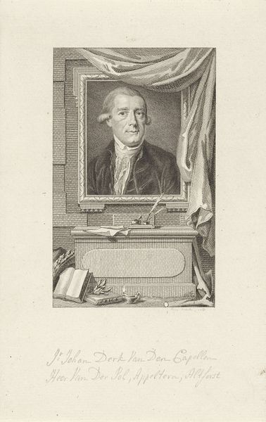 This is Reinier Vinkeles's portrait of John Wilkes, made with etching. The composition is immediately striking. Wilkes appears to be in mid-gesture, drawing back a curtain as if to reveal himself to the viewer. The lines, though finely etched, create a sense of depth and texture, particularly in the rendering of the curtain and Wilkes’s elaborate attire. The texture of the curtain contrasts with the smoother finish of his coat and face, drawing the eye to different focal points within the image. The use of light and shadow is carefully controlled, emphasizing the dramatic moment of revelation. Wilkes is not merely being depicted; he is being presented. The etching technique itself contributes to the artwork’s meaning. The precision and detail achievable through etching lend a sense of exactness and control, perhaps reflecting the structured political discourse Wilkes was known for. This work challenges the static nature of portraiture, injecting a sense of theatricality and engagement that invites the viewer to actively participate in the unveiling.