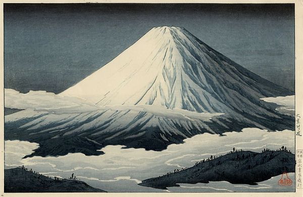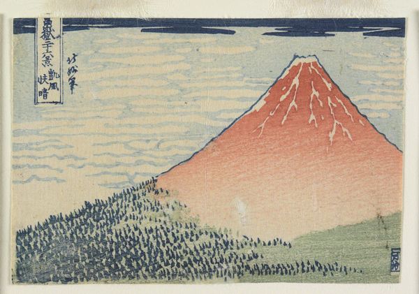 Curator: So striking—almost severe. Is that Mount Fuji? Editor: Indeed. This is "Rainstorm beneath the Summit," a woodblock print made with ink and watercolours dating from about 1834 to 1837, attributed to Hokumyō and currently held at the Minneapolis Institute of Art. Curator: The title suggests turmoil, but the mountain's iconic, near-perfect silhouette feels very stoic. The woodblock technique, combined with the simple composition, intensifies the enduring, almost mythic presence of Fuji-san, don’t you think? It resonates with its long-standing sacred status. Editor: Well, what catches my eye is the actual process here. Look at those crisp lines; it tells of meticulous carving. The limited palette points to careful considerations of pigment availability and printing costs as well. This wasn’t just a landscape exercise. The mountain as a commodity, made replicable for the rising merchant classes… Curator: I see your point—though I read more in the enduring power of nature conveyed in it. Even in miniature, which by the way is due to the ‘koban’ size, these inexpensive woodcuts gave anyone the ability to commune with Fuji and with its power as a Shinto deity. Editor: The ‘koban’ size is also a format for popular commercial prints: affordable objects shaped through an evolving economy. Mass consumption changed symbolic power, but what interests me here are the socio-historical roots and material circumstances informing these shifts, and I see that at work even within an image that conveys itself as simple. Curator: True, Ukiyo-e, as a whole, are inseparable from the culture of Edo-period Japan; nonetheless, "Rainstorm beneath the Summit," like many other works from the "Thirty-six Views of Mount Fuji," shows that symbols evolve beyond their origin and context to hold multiple meanings across centuries. Editor: Ultimately, examining Hokumyō’s work leads one to a broader conversation of artistic production intertwined with economic, political and technological advancements. And it makes me think about the copies produced today! Curator: For me it points to how the images—particularly potent ones like these—root and reroot themselves in our cultural memory.