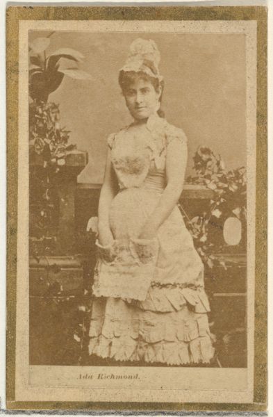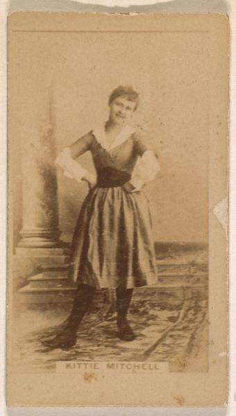 Editor: Here we have "Mlle. Ascenseur" from the Actors and Actresses series, made between 1890 and 1895 by W. Duke, Sons & Co. It looks like a photographic print. There’s something playful about her pose; what stands out to you? Curator: The performative nature of this photograph speaks volumes. It was mass-produced as a cigarette card, an advertisement. What does it mean when we commodify images of women, especially actresses, for the consumption of largely male audiences? Editor: So, you're saying it's more than just a portrait; it's also a statement about the role of women in entertainment and advertising? Curator: Precisely. Think about the actress’s control – or lack thereof – over her own image. The gaze is directed outward, towards the consumer. How much agency did she really have in how she was presented? And how does the act of smoking, linked to this image, complicate the narrative of feminine ideals during this period? Editor: That's interesting, I hadn't considered the connection between smoking and the image. It makes me wonder about the intended audience and what message they were supposed to receive. Curator: These images weren't simply innocent portraits. They perpetuated certain ideas about women, performance, and desire. Recognizing that, what critical questions might we ask when viewing similar images today? Editor: I guess understanding the social context really shifts the way we look at seemingly simple images. Curator: Absolutely, it encourages us to think critically about representation and the power dynamics inherent in visual culture.