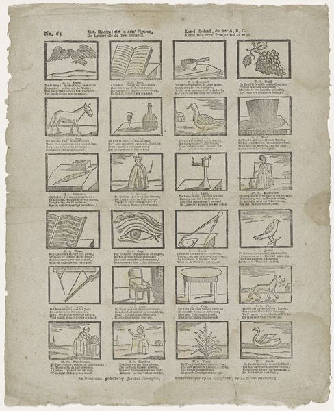 This print, titled ‘Here you have eighteen beautiful pictures’ was made by Jacobus Thompson. On a single sheet, eighteen small scenes are arranged in a grid, each a tiny window into everyday life. The linear quality of the engraving, with its stark contrast between black ink and the white paper, emphasizes the basic geometric shapes within each frame. Each scene uses the same formal language of line and shape, creating a rhythmic pattern across the whole print. Within this structure we glimpse children playing, people working the land, and moments of daily activity. The rigid grid contrasts with the spontaneity of life that the images depict. The grid-like structure imposes order, categorising a diverse range of human experiences. The artist seems to suggest the underlying structures that organize and give meaning to everyday life. It invites us to look closer at how individual moments fit into larger patterns.