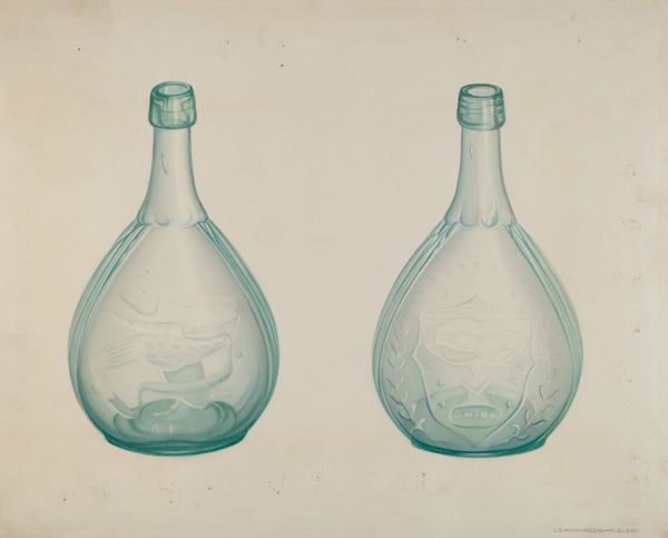 Loraine Makimson, born in 1855, made this drawing of a bottle with watercolor on paper, though we don't know exactly when. What a lovely, quiet rendering! I really get a sense of the delicate, see-through quality of the glass. Look how the watercolor is applied in thin washes, letting the white of the paper peek through, creating a luminous effect. The subtle gradations of color give the bottle shape, and those thin aquamarine outlines define it. The little etched design of foliage in the center feels so personal. It's like a secret message, slightly smudged, almost disappearing. Makimson wasn’t trying to trick us into thinking this *is* a bottle, she’s embracing the nature of painting as a way to conjure it, to celebrate its subtle translucence and the soft light it holds inside. Reminds me of Morandi, quietly contemplating those dusty bottles in his studio. It's a really contemplative piece.