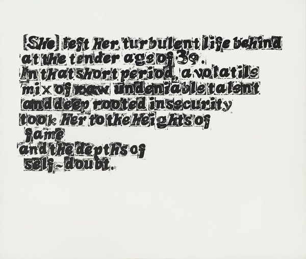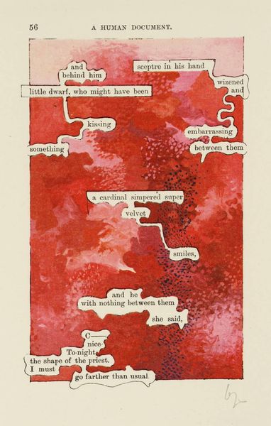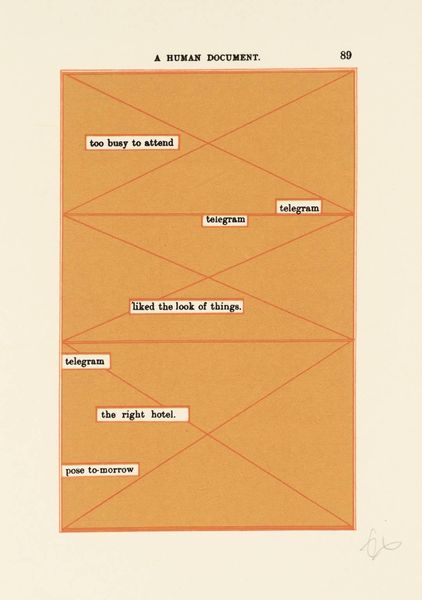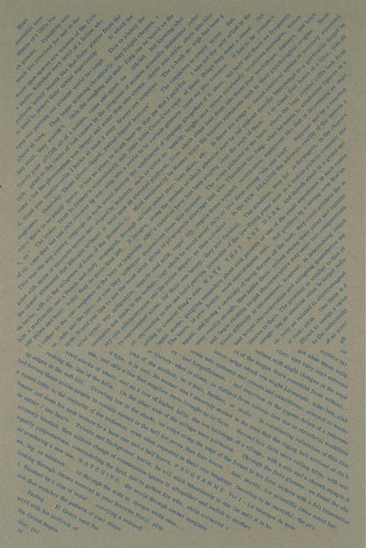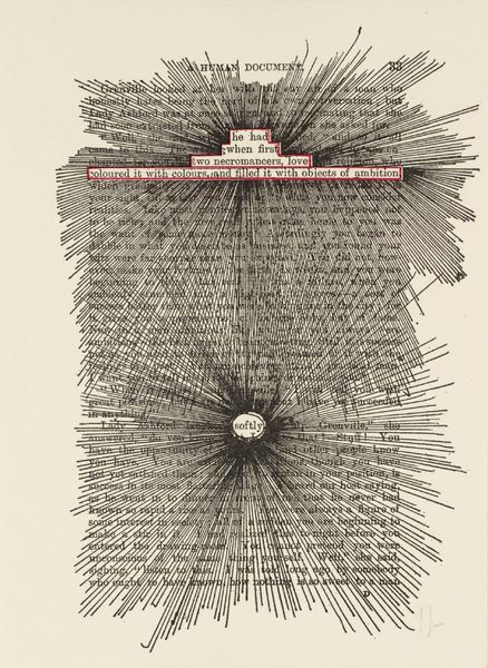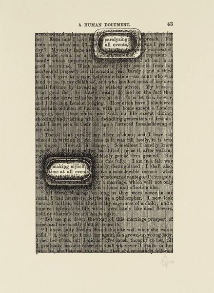 Curator: This intriguing piece, simply titled "[no title: p. 337]," is by the artist Esq Tom Phillips. The work resides in the Tate Collections. What are your initial thoughts? Editor: The contrast immediately strikes me—the dark, almost chaotic hatching above, set against the highlighted, narrative text below. It's like two worlds colliding on the page. Curator: Indeed. Phillips often incorporates found materials and collage techniques. The selected text emphasizes labor, illness, and social hierarchies within the doctor-patient relationship, revealing the consumption of care. Editor: From a formal perspective, I see the strategic use of green to highlight specific phrases, guiding the eye and creating a visual pathway through the dense text. The overlaid mark-making obscures while simultaneously revealing fragments of meaning. Curator: Precisely. Phillips challenges our traditional understanding of reading and seeing, prompting us to consider the underlying structures that shape our perceptions of text and image. Editor: It’s a compelling piece. I am captivated by the way the artist guides us through it.