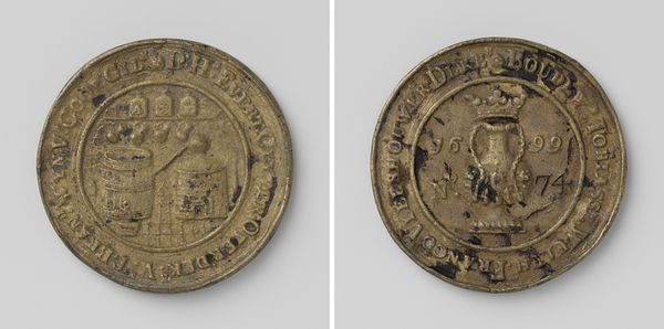 Editor: So, this is “Zeeslag bij Vigo (Vigos): het verbranden van de Franse en Spaanse vloot” – the naval battle of Vigo, and the burning of the French and Spanish fleet–created around 1702 by Martin Schmeltzing. It looks like a medal or coin of some kind. It seems to depict quite a bit of symbolic imagery. How do you interpret this work? Curator: Well, beyond its function as a commemorative medal made of metal, let's think about what this piece *does*. Medals like these were not passive objects; they were tools of propaganda and power. Consider the historical context: this medal depicts the Battle of Vigo Bay in 1702 during the War of the Spanish Succession. What do you notice about which nations are celebrated versus demonized through its imagery? Editor: I guess I hadn’t thought about the level of... spin that was happening in real time. I suppose I see what looks like a French symbol that is under attack, while what looks like English royal imagery feels like the focus. Curator: Exactly! And who would have possessed or viewed this medal? What socio-economic class? Understanding who it speaks to, or *for*, is key to interpreting its narrative. How does situating this object within the complex web of 18th-century European power struggles shift your understanding? Editor: It makes me think more critically about whose story is being told and how biases are embedded in even seemingly objective historical artifacts. Curator: Precisely. Recognizing those power dynamics helps us engage with the piece not just as a historical document, but as a carefully constructed argument. What have we learned? Editor: I now understand how important it is to consider historical context and the intended audience when analyzing art. It’s really more than just aesthetics or historical record.