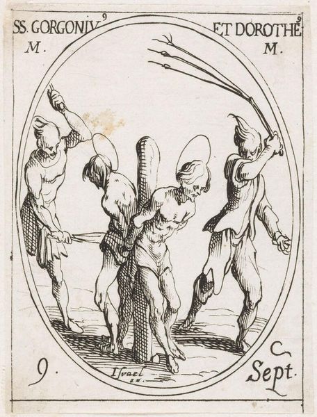 Editor: This is Jacques Callot's "Saint Candida", a small etching. The composition is quite striking, with these figures looming over the kneeling saint. What draws your eye in this piece? Curator: The dynamism is achieved through the cross-hatching, creating a sense of movement. Note the careful rendering of light and shadow, particularly on the figures' musculature, emphasizing their aggression and contrasting with Saint Candida’s serenity. Editor: So, the contrast between light and shadow contributes to the overall narrative? Curator: Precisely. The formal elements work together to construct meaning beyond the representational scene. Editor: I see that now. Thanks for pointing out the significance of the etching's inherent formal qualities. Curator: It is a complex piece, made simpler by the mastery of the artist.