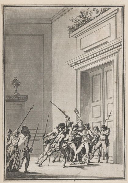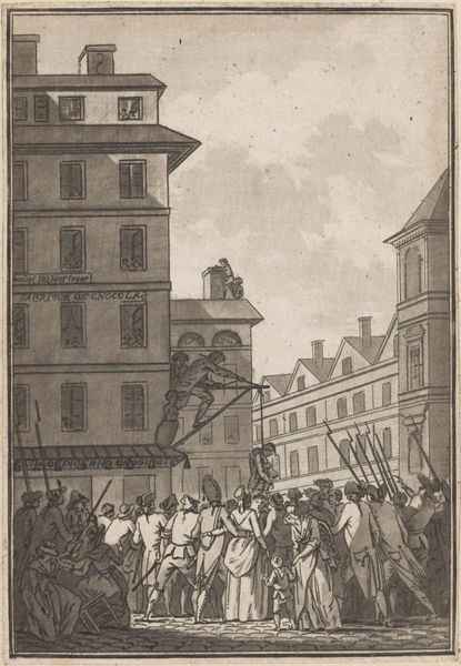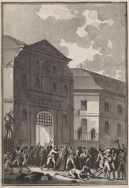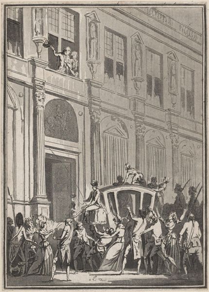 Curator: This print, made by Jean François Janinet, depicts the Abbé Maury on April 13, 1790. Immediately, I notice the tension conveyed through its composition. Editor: It's quite dynamic. The stark contrast emphasizes the chaotic energy of the crowd versus the rigid architecture, doesn’t it? This speaks to the social unrest, right? Curator: Indeed. The etching technique, with its precise lines, almost documents the event. It makes you consider the availability of materials and printmaking's role in disseminating revolutionary sentiment. Editor: And the theatrical figures in the windows. What does their gaze tell us about perspective and class in this turbulent time? Curator: It speaks to how printed images shape our understanding of history and the labor inherent in creating these visual narratives. Editor: I see that now; it's a window into a complex past. Curator: Precisely, a past built on material realities and artistic choices.