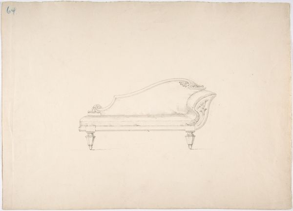 This drawing presents a design for a sofa with a distinctive, wing-like arm, accompanied by a chair and stool. Executed by an anonymous artist, the monochromatic scheme emphasizes the forms and contours of the furniture. The composition is meticulously rendered, with each piece displayed in a straightforward, frontal view. The linear precision and delicate shading articulate the textures and volumes, inviting a tactile sense of the envisioned upholstery and carved details. The arrangement of the furniture, while functional, suggests a semiotic interplay between individual comfort and social engagement. The sofa, with its singular, wing-like arm, disrupts conventional symmetry, hinting at a shift from formal, balanced designs to more dynamic, asymmetrical forms. This design element introduces a subtle tension, destabilizing traditional notions of domestic space and suggesting a new, more fluid approach to interior design. The drawing challenges fixed categories of furniture design and explores new ways of thinking about space.