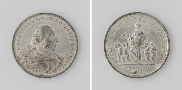Curator: It has a striking duality, doesn’t it? One side with the serene profile of a statesman, the other a furious scene of struggle. Editor: Absolutely. And there's a severity to it. Almost funereal, if you ask me. What can you tell me about it? Curator: This is "Overlijden van Georges Clemenceau 1929," or "The Death of Georges Clemenceau, 1929," a bronze relief by H. Dropsy. The piece commemorates the French statesman, featuring his portrait and symbolic imagery reflecting his legacy. It's a fine example of Art Deco memorial art. Editor: Ah, Art Deco—that explains the stylized figures on the reverse! Who is she? Curator: That is a personification of France, defending a dying soldier from a dark figure looming behind. Note how she is very classical in appearance; the cultural memory evoked by classical form endures. Editor: I can see that continuity in style, yes. But is it just me, or does that dark figure almost seem more... powerful? Curator: The composition hints at the great battles that Clemenceau was influential in, with France acting as a protector of their army and their values in the face of struggle and threat. Its emotional resonance comes from that ongoing battle, I feel, an anxiety present even at a memorial. The shadowy figure is forever at our heels. Editor: The piece reflects its period: Clemenceau died in 1929. The "war to end all wars" hadn’t banished war at all; it had simply sown seeds for new conflict, so it speaks to the mood of the time. This relief would be such a statement to display! It would feel very political even if it’s just honoring his service as a leader during conflict. Curator: I concur. Art continues to provoke and commemorate simultaneously. And that, perhaps, is what makes it endure. Editor: Yes, Dropsy memorializes a single man, but hints at broader battles. Intriguing. Thank you for illuminating this relief.