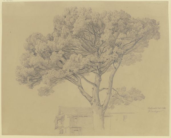 Curator: Here we have Friedrich Wilhelm Ludwig's "Pinie im Giardino Barberini in Rom," a pencil drawing dating to March 1851, housed here at the Städel Museum. Editor: There's something so delicate about this rendering; the light is captured beautifully despite the simple medium. The lines feel almost like whispers. Curator: I find the choice of the pine particularly telling. In ancient Roman culture, the pine tree held great symbolic significance. Associated with fertility, immortality, and even military prowess, it was a common motif in funerary art. It speaks volumes about Ludwig's potential fascination with the weight of history embodied within the landscape itself. Editor: You see fertility, I immediately register resilience. This isn't just a sketch of a tree; it is a meditation on material and labor. Consider the production of pencils in the mid-19th century: the mining of graphite, the shaping of wood, the skill involved in creating such a finely pointed tool, and then consider the labor the artist expended to create such fine, intricate marks across the paper. All this labour represented in a landscape view. Curator: That is a very pragmatic interpretation. I cannot help but think about how pinecones and their association with the pineal gland. The 'pine cone' may symbolize spiritual enlightenment. Editor: Symbolism, always a favourite topic. To me, that reading pulls it away from the real context. What fascinates me are the visible layers and labour the artist undertakes: there's a rawness to pencil sketches that transcends mere representation and becomes evidence of a working process. The humble pencil itself has undergone an evolution through craft and technological innovation; consider what materials such as the ground pigments do for creating those subtle effects. Curator: Interesting how our focus diverges. For me, the very 'real' act of depicting that particular tree links it to larger symbolic meanings; its very structure speaks to how one era interprets older themes. Editor: A compelling point! Ultimately, Ludwig's study offers a window into his moment in time, his tools, his place, and into the materials that make such acts of observation possible. Curator: A moment captured, echoing long into the past and rippling into the present through our interpretations.