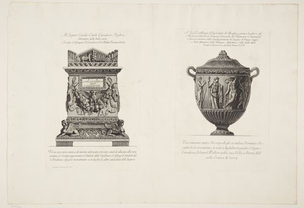 This print of a marble vase, flanked by griffons, and a group of women supporting a vase, was made by Giovanni Battista Piranesi in the 18th century. Piranesi was fascinated by Roman antiquities and his prints reflect a deep engagement with the material culture of the past. Here, the graphic medium is etching, a process involving the biting of lines into a metal plate with acid, which is then inked and printed. The incised lines mimic the texture and form of carved marble, emphasizing its inherent qualities. The vase, ornamented with griffons and foliage, and the figures of women, allude to classical forms. The amount of work involved in the production process, from quarrying the marble to carving the intricate details, speaks to the labor and skill invested in creating such objects. Piranesi's print invites us to consider the social context of these decorative objects and the cultural significance they held in their time, underscoring the dialogue between art, craft, and design.