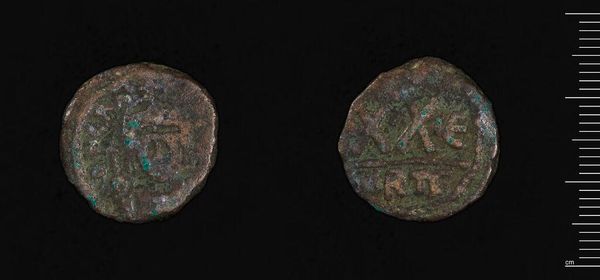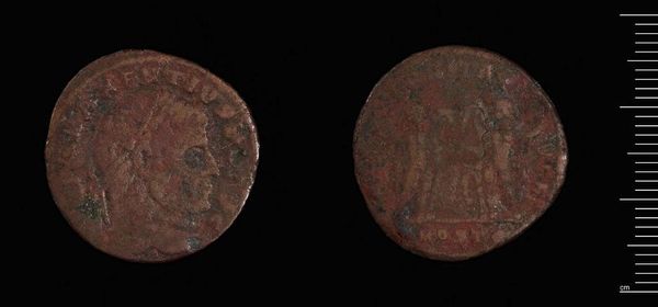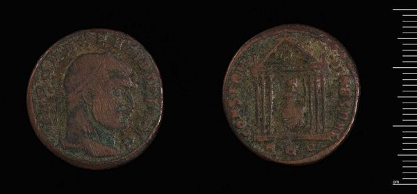 Editor: Here we have the Follis of Maxentius, a Roman coin held at the Harvard Art Museums. It's quite small, and the bronze is heavily patinated. What symbols or meanings resonate with you when you look at this? Curator: The portrait of Maxentius himself, facing right, embodies imperial power. But look at the reverse. What do you see depicted there? Editor: It looks like a temple or a gate of some kind? Curator: Precisely! It's likely meant to evoke the Temple of Venus or Roma, symbols of Roman power and legitimacy. This coin visually attempts to connect Maxentius with those established ideals. Editor: It’s a fascinating way to see how even everyday objects can become powerful tools of propaganda. Curator: Indeed, and by understanding the visual language, we can decipher the messages they intended to convey.