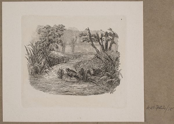 Curator: Welcome! We are standing before Vilhelm Kyhn's illustration, crafted around 1838 as a print. It is an engraving, titled "Illustration til O. Specter, "Fabler for Børn"". Editor: The first impression I get is…unease. The lines are delicate, but there's a latent tension here. A quiet, melancholic scene with high stakes! Curator: Absolutely. Looking at the hunter’s clothing, his stance with the rifle—it's a moment frozen in time where the labor of hunting for survival clashes directly with the animal's instinct to flee. Note the contrast in texture; the soft, grassy mound versus the almost frantic, scrabbling marks of the hare. This isn't just a scene, but also about resource management and man's relationship to nature and material procurement. Editor: The hare, for me, represents vulnerability, the swift movement captured is an ancient symbol. Consider the folklore across different cultures—sometimes it’s associated with the moon, intuition, or heightened senses. This chase touches on themes of predator and prey which resonate deeply in our psyche. Curator: Agreed. Kyhn worked within the confines of readily available materials. Paper and ink. But what’s significant to consider are the means by which this imagery would have circulated. As an illustration for children’s fables, the engraving process ensured multiple copies. It’s a narrative intended to be distributed and consumed. A deliberate, pedagogical effort if you will. Editor: And the visual symbols become crucial in transmitting moral or cautionary messages, don’t they? The landscape almost seems to be observing this dramatic action. It’s not merely a backdrop, it carries this emotional weight. It seems imbued with an awareness of time. Curator: Fascinating how a simple print speaks volumes about societal roles, environmental manipulation, and material culture. A testament to what can be achieved with deliberate application, readily available resources, and skilled labor in visual storytelling! Editor: It highlights the ongoing dialogue between humanity and nature. The hare will continue to signify this fraught relationship, while serving as a constant, universal echo of nature itself.