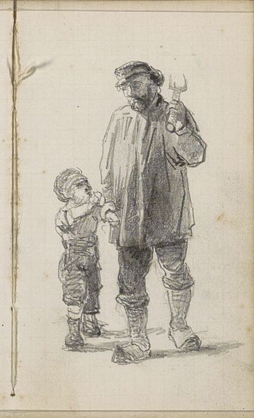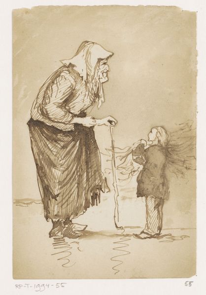 Editor: Here we have Pieter van Loon’s "Father and Son," created in 1870 using pencil. It has a rather humorous, even somewhat dark mood given the father appears to be pinching the son’s ear. How would you interpret this work through a Formalist lens? Curator: From a formalist perspective, attention must be paid to the economy of line. Observe how van Loon employs swift, assured strokes to delineate form, especially in the rendering of the father’s clothing, juxtaposed with the looser, almost frantic lines that define the son’s expression. What effect does this contrast create, would you say? Editor: It accentuates the father’s rigid control against the son’s obvious discomfort and potential resistance, right? It draws my eye to their expressions, highlighting the tension. Curator: Precisely. Further, the composition, deliberately asymmetric, channels our gaze. The strategic use of blank space around the figures accentuates their isolation, foregrounding their interaction, don't you think? How does the absence of background details contribute? Editor: It focuses everything on the figures, removing any distractions and amplifying the raw emotion of the moment. It's almost like the artist wants us to analyze solely the depicted figures in front of us, stripped away from a contextual background. Curator: A cogent observation. It's precisely through dissecting these formal relationships that we uncover the intrinsic qualities and potential narrative power embedded within the drawing itself. Editor: I see it so much clearer now! Analyzing line, form, and the strategic void definitely emphasizes the dynamic – and the emotional core – of the drawing. Curator: Indeed. It's by attending to these formal aspects that the drawing speaks volumes, wouldn’t you agree?