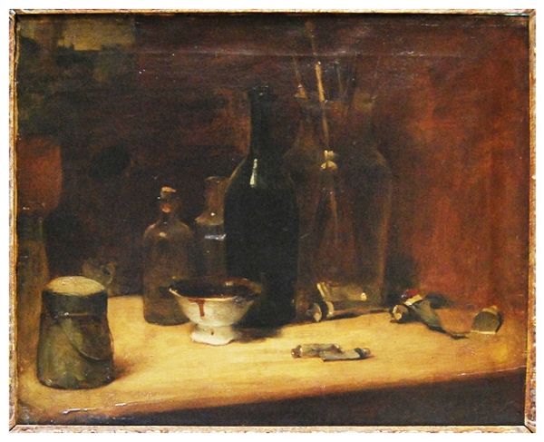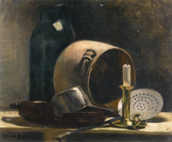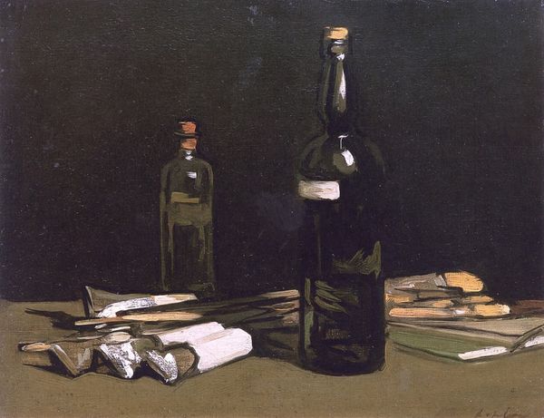 Jean-Baptiste-Siméon Chardin created "The Leftovers of a Lunch, also called the Silver Goblet" with oil paints, during a time when France was transforming through industrial advancements. The muted tones and the composition give a glimpse into the more private aspects of daily life, hinting at a culture of material consumption. Look closely, and you’ll see how Chardin expertly captures the textures: the matte surface of the pewter plate, the glint of the silver goblet, and the crusty bread. The rough wooden table and the simple knife suggest a narrative beyond mere objects; they speak to a social context marked by labor and class. Chardin's approach to painting, focusing on the sensory qualities of everyday objects, elevates the mundane to a level of sophistication we often reserve for more traditionally valued subjects. By paying close attention to the materials, making, and context, we can discover the cultural and social values embedded within this intimate still life.