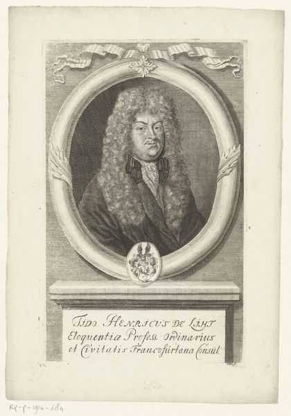 Elias Hainzelmann produced this portrait of David Thomann von Hagelstein using etching techniques. The composition centres on an oval frame, neatly containing the subject. The artist masterfully plays with contrasts of light and shadow. It gives a palpable sense of texture to the hair and clothing, imbuing the figure with a weighty presence. The structure of the portrait—the oval frame, the symmetrical arrangement of heraldic symbols, and the neatly inscribed pedestal—serves to elevate the sitter, reinforcing the visual representation of power and status that was so central to 17th-century portraiture. The intricate details of the lace collar and the rich, flowing hair further emphasize the sitter's affluence. This portrait, beyond being a mere likeness, functions as a signifier of social standing. It invites us to consider how artistic choices can construct and communicate notions of identity and authority.