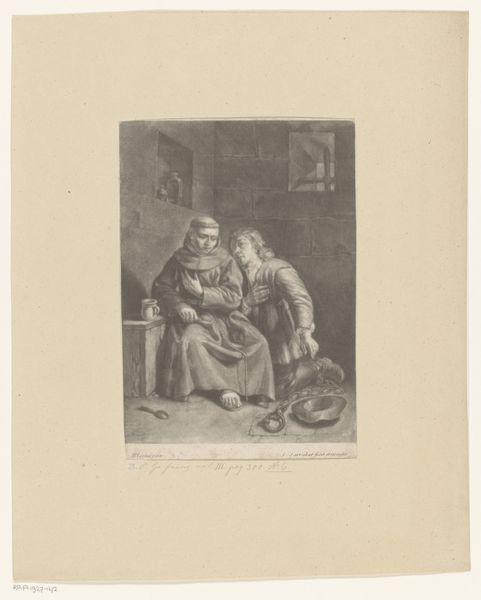 This print of a seated man dressed as a monarch was created by Célestin Nanteuil sometime in the 19th century. The process used to create this image is crucial to understanding its appeal. Nanteuil made it using etching, a printmaking technique that involves using acid to cut into a metal plate, which is then inked and pressed onto paper. This image, with its intricate detail and tonal range, showcases the artist's mastery of the etching process. The cross-hatching and fine lines would have demanded a high level of skill and patience to execute, pointing towards a significant investment of time and labor. The image has a stark contrast, which contributes to its dramatic feel. Paying attention to such production details allows us to appreciate the labor and skill involved in creating art, challenging the distinction between high art and craft.