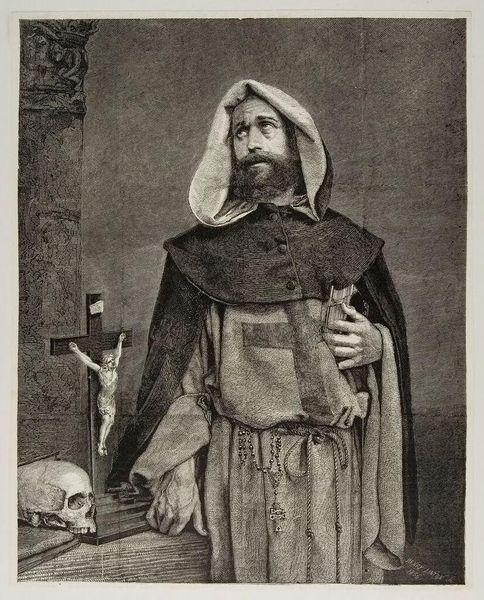 Édouard Riou's "Boubakar-saada, King of Bundu" captivates with its detailed linework, crafting depth and texture entirely through hatching and cross-hatching. The somber tones and meticulous detail invite contemplation on its subject. The composition emphasizes a study in contrasts and textures. Light catches the folds of Boubakar-saada's draped clothing, creating a sense of volume against the stark, shadowed backdrop. This contrast isn't just visual, it seems to ask: how are we to perceive this figure? Is he defined by his regality, signified by the medal, or by the weight of his repose, suggestive of colonial pressures and the negotiation of power? This piece destabilizes a straightforward interpretation of portraiture, challenging viewers to consider the complex interplay between representation, identity, and colonial context. How does the artist engage with contemporary philosophical concerns about power, representation, and the cultural gaze?