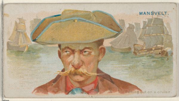 Editor: This small card, titled "Building Castles," shows a seated man in uniform, pipe in mouth, with tents in the background. It feels melancholic. What can you tell me about it? Curator: This card likely originates from the late 19th century. Consider the title, "Building Castles." It suggests dreams, aspirations perhaps deferred in the face of duty or hardship. How does his relaxed pose contrast with the context of military service? Editor: I see what you mean. The title implies a certain futility, too. Curator: Exactly. These images often served as sentimental reminders, both promoting and perhaps subtly critiquing the ideals of nationhood and sacrifice. Thank you, this gives me a lot to think about.