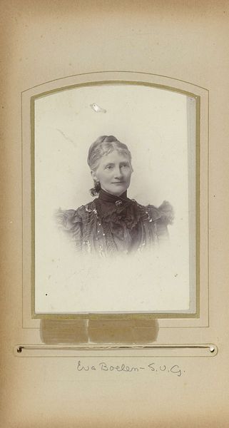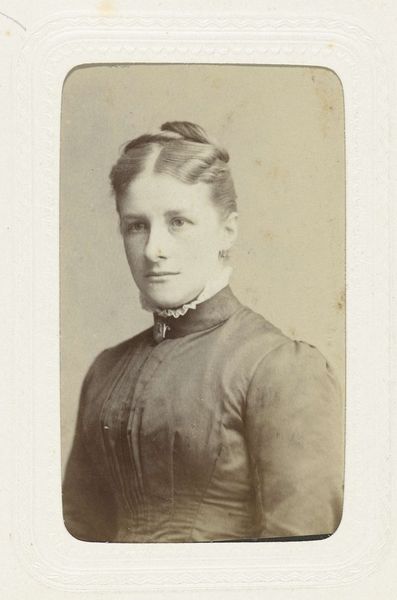 This is Willem Gerhardus Kuijer's "Portret van een vrouw," an intimate portrait captured with photography, a relatively new medium in the 19th century. Kuijer was working in a world where photography was beginning to democratize portraiture, moving it away from the exclusive realm of the wealthy. The woman's gaze is direct and self-possessed. There's a quiet strength in her eyes that invites contemplation. The details of her dress, the high collar, and the intricate patterns, speak to the constraints and expectations placed on women of the era. The photograph, in its formal composition, upholds societal conventions but, the sitter's expression hints at an inner life, a silent dialogue between her public persona and private self. This small portrait invites us to consider the complex interplay between identity, representation, and the gaze. It reminds us that every image carries within it a story of power, history, and the enduring quest for self-expression.