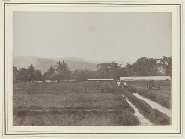 Curator: Isidore Kinsbergen's gelatin silver print, possibly created between 1873 and 1879, is entitled "Laan naar de Borobudur". Editor: It feels strangely calm. There's something almost geometrically composed about the image that gives it a powerful, contemplative presence, despite the muted palette. Curator: I agree. Notice the stark tonal contrast – a very common feature of 19th-century photography. That starkness really lends itself to this sensation. Kinsbergen's imagery invites a journey, both literal and perhaps spiritual. The symmetry almost hints at ritualized progression. Editor: The repeating motif of the trees has symbolic value beyond just the plants. These framing elements seem intended to orchestrate our gaze, leading us towards what? Some kind of resolution represented in the dwelling or further vista? Also what do you think it reflects of Dutch orientalism? Curator: That's interesting that you're reading them as such symbolic motifs. Given the history of Dutch colonial involvement in Indonesia, it speaks, perhaps unconsciously, to power and control. The photograph frames and domesticates the landscape, transforming it into a subject for European consumption. The architecture serves as a type of cultural shorthand of "the Orient," ripe with colonial associations. It's about making this land knowable and therefore controllable. The image subtly reinforces colonial power dynamics by presenting the viewer as an outside observer looking in, possessing a privileged gaze. Editor: Your observations about how the dwelling symbolizes power are enlightening. Considering these photographs through the lens of colonialism allows us to interrogate the psychological effect of exoticism on both the colonizer and colonized. Curator: Absolutely. And while the calm captured is visually beautiful, acknowledging the layers of meaning encoded within such an image asks us to look closely at the power and the history behind beauty. Editor: Kinsbergen's work, then, becomes a prompt to consider not just what we see, but the historical conditions that enable that very act of seeing. Curator: A pertinent reminder indeed.