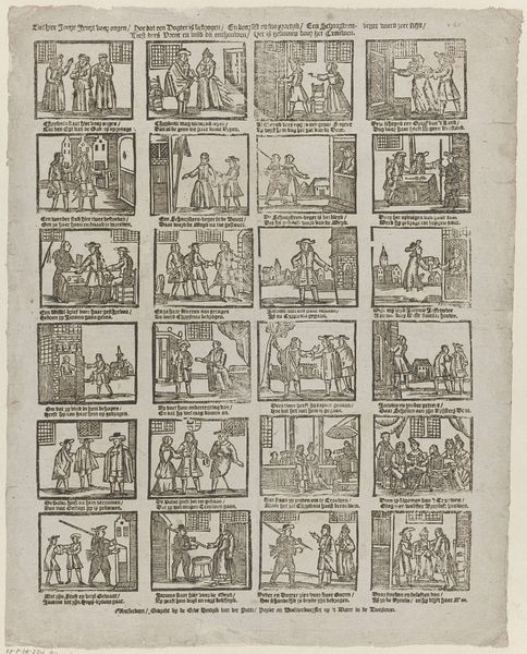 Editor: This is "Kraaiwinkel was een fraaije stad…", an engraving by Erve Wijsmuller, dating from sometime between 1832 and 1850. It’s like a comic strip, but with a strange, old-fashioned feel. I'm drawn to the repetitive grid structure, yet each scene is so bizarre. What symbols jump out at you in this piece? Curator: The entire sheet reads as an allegory of society. Notice how professions and social interactions are depicted through distorted lenses, a common motif to critique societal norms and values of that period. The 'Kraaiwinkel', or "crow shop," suggested by the title, implies a marketplace of folly or absurdity. Do you notice recurring visual cues that suggest this? Editor: Well, everyone seems overdressed and comically busy with tasks that appear pointless. The juxtaposition of authority figures, like soldiers, alongside everyday scenarios feels like a commentary on power. What's with the emphasis on interactions between characters that are so theatrical? Curator: Precisely! The clothing acts as a shorthand, categorizing people within the rigid hierarchies of the 19th century. However, by making these figures so caricatured, the print questions the very foundations upon which that structure rests. The performance you noticed underlines the artifice inherent within those social roles. Editor: It's clever how the artist uses simple visual language to create complex layers of meaning. Seeing those cultural symbols recontextualized provides new ways to understand Dutch society at that time. Curator: Absolutely. The artist employs humor and satire, as tools to expose human follies and societal quirks, inviting us to reflect on how those very symbols operate, even today.