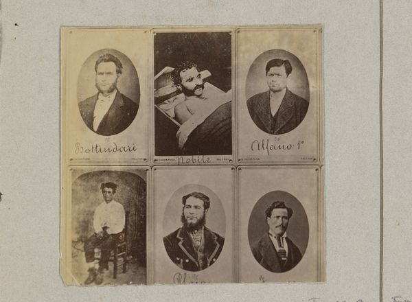 This is a photographic print titled "Booth and his Associates," created by Joseph Ward around the mid-19th century. The composition immediately strikes us as a grid, a formal arrangement of portraits contained within individual frames, all surrounding the central figure of Booth. The use of the grid structure here isn't just about organization; it’s a visual statement. By placing Booth at the center, Ward establishes a clear hierarchy, emphasizing his role as the nexus of this group. The other figures, though individually framed, are visually subordinated, arranged as satellites around the central 'sun'. The monochrome tones contribute to a sense of gravity, while the stark contrast between the faces and the neutral backgrounds invites us to scrutinize each individual. This structured presentation lends itself to a semiotic interpretation, transforming the subjects into signs within a larger narrative of conspiracy and historical significance. The form of the grid implies order and control, yet the historical context destabilizes any sense of harmony.