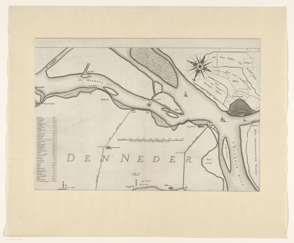 Curator: Immediately I am struck by a sense of calm precision. The lines, while simple, clearly depict a region with a detailed understanding. There is almost an ethereal stillness in its monochromatic rendering. Editor: This is a pen and ink drawing, possibly an engraving, created sometime before 1757 by an anonymous artist, titled "Kaart van het gebied tussen Den Bosch en Geertruidenberg met dijkdoorbraken (zesde blad)," meaning “Map of the area between Den Bosch and Geertruidenberg with dike breaches (sixth sheet)." It presents a specific geographic location, but hints at much larger social events that changed the land itself. Curator: A map then! Look how bodies of water snake and claim dominance, and how little sailing ships populate its deltas. Given the time, would these dikes have symbolic significance? Was overcoming this geography seen as strength? Editor: Precisely! Dikes, breaches, the controlled and uncontrolled. We must look at the struggle with water here as deeply sociopolitical. Control over water literally meant control over life, agriculture, trade… the power to determine who thrives and who suffers when the inevitable flooding comes. I’d argue the map is therefore not a neutral document but one intrinsically connected to the ruling power’s narratives. Curator: That tension is clearly depicted; human markers attempting to establish boundaries, juxtaposed with waterways moving beyond constraint. Perhaps the map attempts to imbue those structures with enduring symbolic authority, despite their proven fragility. There are cities that serve as visual metonyms of human ingenuity, points of organization upon the chaos. Editor: Yes, each mark conveys not just spatial data, but values of dominance and security. Viewing these landscapes outside their technological and economic implications means missing half the story. Each little boat and town becomes a marker for trade routes, defense strategies and the power relations between people. Curator: Thank you, that really allows us to consider both its design and function. Editor: And hopefully to see the hand of the powerful even where its direct expression is absent. It makes you question what a map does, or even is *for.*