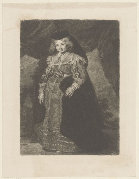 Editor: We’re looking at “Gezicht op een zanderij bij Ukkel,” or “View of a Sand Pit near Ukkel,” an 1897 intaglio print by Pol Craps. It strikes me as incredibly formal, almost stoic. What do you see in this piece beyond just a historical portrait? Curator: What I see is a commentary on power, gender, and the gaze itself. This engraving presents a woman, likely of high social standing given her attire, but it’s doing so within a very specific historical and societal framework. Think about the era. What does it mean to portray a woman like this at the cusp of the 20th century? Is it a celebration, a critique, or something more ambiguous? Editor: That's a good point. The subject is certainly presented in a controlled, almost posed manner. How does that relate to power dynamics? Curator: Well, consider who controlled the means of representation. Men were largely the artists, and therefore held the power to define and depict women according to societal expectations. The sitter’s clothing and accessories—the high collar, the layered garments— speak to a specific construct of femininity. Is it restrictive? Liberating? That’s part of the dialogue. The act of portraiture was historically tied to status, wealth, and who gets to be remembered. Whose stories are valued and why? Editor: So you're suggesting that even seemingly straightforward portraits are actually embedded with complex messages about identity and social structures? Curator: Precisely! And this engraving, being a reproduction, layers another level. How does the act of reproducing and distributing images influence how these messages spread and who has access to them? Who gets to see it? Who owns it? Those are important questions that still resonate today. Editor: This makes me see the artwork beyond its surface appeal, and more as a cultural artifact with its own story to tell. Curator: Absolutely. Art provides a window into understanding not only the past but also the ongoing power dynamics that shape our present. It challenges us to question what we see and how we interpret it.
