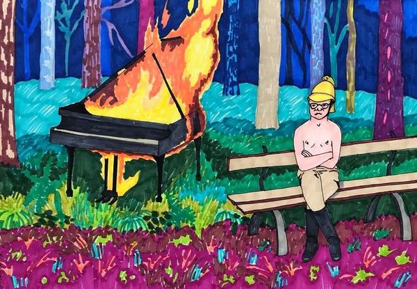 This Untitled artwork was made in 2018 by Kinder Album, using what looks like felt-tip pens. I love the way the artist works with these materials, embracing the slight messiness that comes with the territory. It feels like they're really enjoying the process, not trying to be too precise. The colours are really striking: a purple forest, contrasting with the yellow field, almost glowing against each other. The way the artist uses line to define the forms is also interesting. See how the lines aren't always neat or consistent, but they have a sense of energy about them? It reminds me of someone like Alfred Jarry, the way it embraces the absurd and the unconventional. Overall, this piece invites us to embrace the unexpected and find beauty in the everyday. It's a reminder that art doesn't always have to be serious or profound, sometimes it can just be playful and a little bit weird, and that's okay.