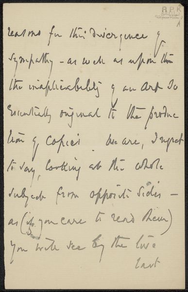 Editor: This is “Brief aan Philip Zilcken,” possibly from 1913, by Joseph Pennell. It appears to be ink on paper – a handwritten letter, almost like a personal sketchbook page. The lettering feels so deliberate, almost calligraphic. How do you interpret this work, with its emphasis on the written word? Curator: For me, this letter is a fascinating window into a specific cultural moment, mediated through Pennell's artistic sensibilities. Think of handwriting itself as a symbolic act – it reflects a personal history, a social standing, a commitment to craft in an era when the mechanical reproduction of text was rapidly evolving. Editor: So the choice of handwriting over, say, a typewriter, is significant? Curator: Absolutely! It roots the communication in a tradition. Calligraphy, especially, has historically been linked to notions of authority, sacred texts, and the preservation of knowledge. Even in its slightly informal state here, we see echoes of that. And look closely - how does the rhythm of the handwriting itself contribute to the overall emotional tone? Does it seem rushed, careful, assured...? Editor: I see what you mean! It's not perfectly uniform, it varies and there are crossings-out. It gives it an urgent yet personal feel. Almost like overhearing a private conversation. Curator: Precisely. That interplay between formality and intimacy, the conscious invocation of tradition alongside a spontaneous expression of thought, tells us so much about Pennell and his relationship with Zilcken, and maybe even with the wider world of art and ideas at the time. I see a tension between the public role of “letter-writing” and the deeply felt experience it conveys. Editor: It’s incredible how much the style of the writing itself contributes to its meaning! I'll definitely look at handwriting differently from now on. Curator: Indeed, every stroke carries a story! It encourages us to remember all those unseen connections we humans build and maintain over time through symbols and marks, on and off the canvas.