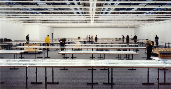 Parliament 1998 is a vertically oriented colour photograph by the German artist Andreas Gursky that is nearly two and a half metres tall and more than a metre and a half wide. Taken from an elevated perspective and seemingly through a window, the photograph depicts the assembly hall of the German parliament (Bundestag) in Bonn. The gridded pattern of the window frames through which the scene is captured divides the composition into four horizontal bands. In the bottom two sections of the image, groups of politicians can be seen standing on the floor of the hall and among its curving rows of desks with their bright blue seats. The upper two sections of the scene feature a public gallery overlooking the hall and, at the very top of the composition, a reflection of the scene below in which the floor, desk and blue seating areas are inverted. Although the photograph is of a very high resolution, blurring and refraction are evident in places throughout (especially in its lowest section) and the fragmented impression created by the window bars is heightened by Gursky’s digital manipulation of the image. For instance, in the centre of the work, one rectangular area of the public gallery appears to have been overlaid onto a separate image of the interior, as is suggested by the differences in colour and the number of people sitting on its benches. Furthermore, it is difficult to see what might be the cause of the inverted or reflected section at the top of the photograph, which suggests that it has been added by Gursky digitally. Tate’s copy of Parliament is one of an edition of six.