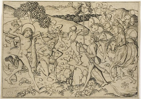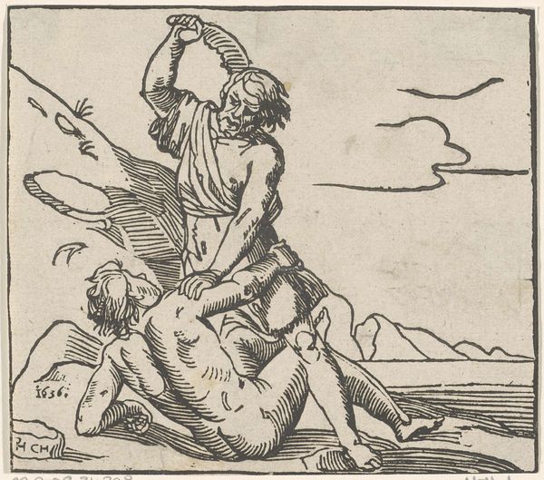 Editor: Here we have Luca Cambiaso’s "Venus and the Three Graces Mourning the Death of Adonis." It is currently held at the Harvard Art Museums, and the stark black and white lines are really striking. What stands out to you about the materials and production of this image? Curator: Well, look at the cross-hatching; it suggests this is a woodcut or engraving, a print. This means reproduction and dissemination. We should consider who had access to such imagery and how this influenced workshops and artistic training. Editor: So, it is not just about the beautiful figures, but also about how easily others could see them? Curator: Precisely. The means of production informs its impact. By understanding the process, we gain insight into its broader social and artistic context. It changes how I see the piece. Editor: I see what you mean. Thanks for opening my eyes to that.