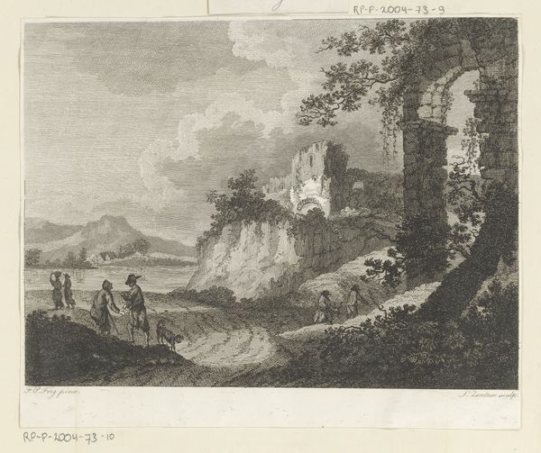 Editor: This is "Ruins on the Bank of a River" by J. L. L. C. Zentner. It evokes a sense of melancholy. What cultural echoes do you hear in this depiction of decay? Curator: I see the ruins acting as powerful symbols of lost civilizations, reminders of mortality and the passage of time. The crumbling arches also symbolize resilience. Do you notice how the figures in the foreground engage with each other, oblivious to the grandeur of the ruins behind them? Editor: Yes, it’s like they’re living in the present while surrounded by the past. The ruins almost become part of the landscape rather than a stark reminder. Curator: Precisely. This interplay speaks to the cyclical nature of history and the enduring human spirit. The image invites us to contemplate the weight of history.