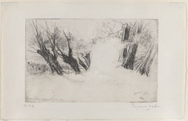 Curator: This lovely drawing, titled "Afternoon Sunshine," is by Denman Waldo Ross. Editor: It evokes a serene and gentle mood, like a half-remembered dream of summer. The lone basket by the path adds to that feeling, doesn't it? Curator: Indeed. Ross seems to have worked with deliberate strokes to define the landscape. Look closely; you can see the layered application of graphite bringing depth and shadow to the trees. Editor: Yes, those trees are striking, almost sentinel-like. Trees are so often symbolic of knowledge, nature, connection to the earth, so it feels fitting here. Curator: And the basket—could it be an intentional commentary on domesticity and labor within this natural setting? What kind of work is the basket for? Editor: Or perhaps it is an offering, a simple gift left for the forest. I love how the artist uses such a humble image to evoke complex feelings. Curator: It certainly highlights how humble materials, like graphite on paper, can be elevated through thoughtful construction. Editor: It's quite affecting how a small, intimate sketch can hold such a wealth of cultural echoes. Curator: Ultimately, it's a testament to the power of drawing to capture a fleeting moment in the material world.