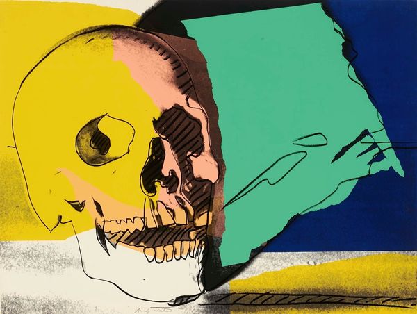 This is one of Andy Warhol's Skull prints, and it's a trip, right? It's all about flat, bold colors and that signature graphic style, like a high-fashion comic book. Look at that gray skull, screened onto the canvas. It's got these scribbled lines and filled-in shadows. It's so simple, but it's also got this weird depth to it. Like, it's flat, but it's also got volume. Warhol was a master of making things look easy, but it's all about the choices he makes: the colors, the lines, the composition. That pink blob behind the skull, for example – it's like a cloud, but it's also totally artificial. It's like he's saying, "Hey, death can be beautiful, too," or something like that. It reminds me a little of Sigmar Polke, who was also playing with pop imagery and messing with our heads. Art's a funny thing, isn't it?