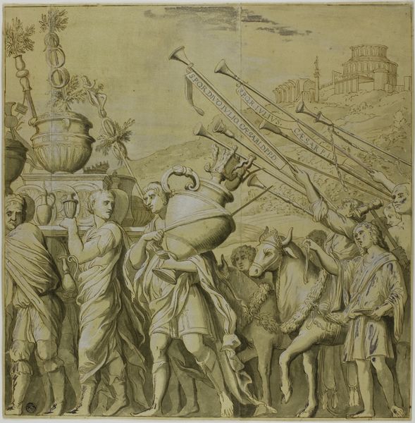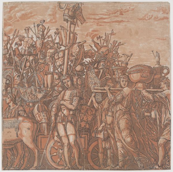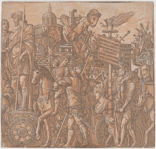 Andrea Andreani created this woodcut titled "Sheet 1: Roman soldiers carrying banners depicting the triumphant victories of Julius Caesar" in the 16th or 17th century. Executed in shades of brown, the print presents a processional scene teeming with figures and intricate details. Andreani uses a layered composition to convey the magnitude of Caesar's triumph. The foreground is dominated by Roman soldiers, their forms rendered with considerable attention to musculature and armor. Above them, banners unfurl, displaying scenes from Caesar's victories in a frieze-like arrangement. Through line and form, Andreani not only recounts historical events but also reflects on the concept of power and the spectacle of victory. The artist constructs a visual hierarchy where the achievements of a leader are elevated through artistic representation. This work prompts us to consider how art functions as a tool for constructing and reinforcing historical narratives. It also emphasizes that the artwork exists as a complex interplay between artistic skill, historical subject matter, and the cultural values of its time.