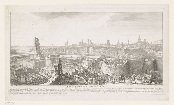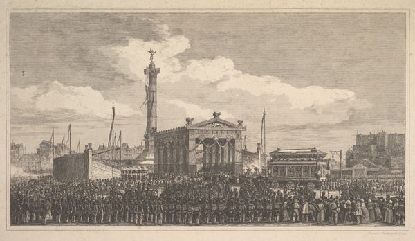 Curator: This is Luigi Rossini’s "Titelprent met triomfboog en triomfstoet te Rome," created as an engraving in 1835. Editor: It's strikingly intricate. The density of detail, the sheer number of figures… it evokes both a sense of grand celebration and almost oppressive monumentality. Curator: The triumphal arch motif has always been laden with symbolism, tracing its roots back to Roman power and imperial ambitions. How does Rossini utilize this loaded signifier in his rendering? Editor: The arch becomes this focal point, right? But also an active site. We see a procession flowing through it, under its symbolic weight, becoming implicated in the narratives of conquest and power inherent to the Roman Empire. Curator: Indeed. By the 19th century, Rome represented a complex convergence of artistic fascination and political weight. This image allows us to dissect prevailing attitudes regarding nationhood and its historical lineages. The artist’s commitment to neoclassical ideals offers a unique window into the cultural dynamics of that era. The image serves to both revere and potentially question the legacy of Roman imperialism within a shifting European landscape. Editor: Precisely! I find the symbolic echoes incredibly potent. The torches, the statuary atop the arch, the very form… all build on archetypes embedded deeply within Western cultural memory, shaping how we perceive power, triumph, and civic identity. It creates such a visual richness to read the composition. Curator: And what of the relationship between gender and power represented in the image? Do you feel the composition is upholding or subverting traditional hierarchies? Editor: Primarily upholding, I’d say. It adheres to very specific performative behaviors. Look at the placement of the leaders at the top of the arch…their gestures seem intended for the masses, underscoring Roman ideas about masculinity, spectacle and dominance. Curator: The artist compels us to engage with that very dynamic: this interplay between tradition and emerging discourses surrounding power. Thank you for shedding such fascinating light on this work. Editor: It’s been a pleasure—Rossini prompts critical investigation of these pervasive symbols within society, urging us to contemplate their evolving meaning.