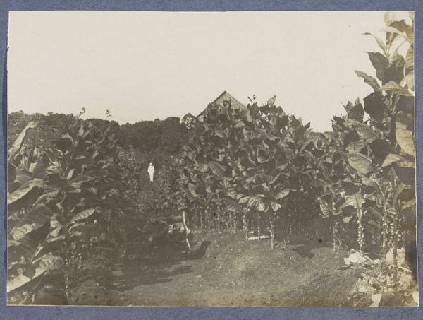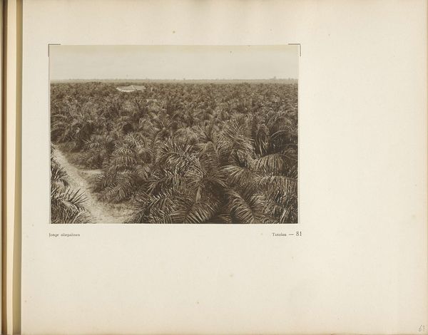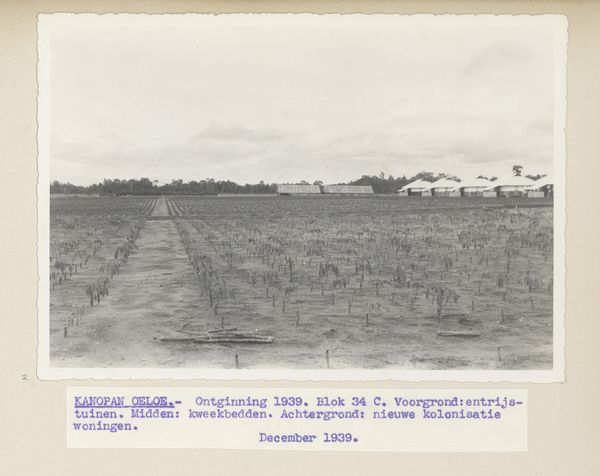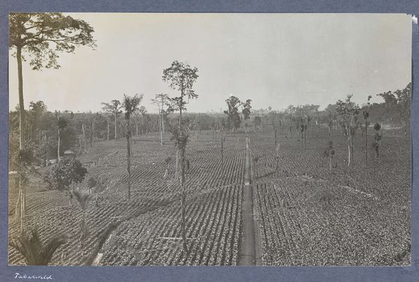 Curator: This photograph, taken in the 1930s, depicts a plantation scene: "Leidong West - Aanplant 1927 met Toeba tusschenplanting". The scene exudes order and yet, I immediately get a slightly ominous, quiet feeling. What is your impression? Editor: It has this strange, regimented beauty. I am mostly struck by the scale and labor suggested. The identical saplings meticulously arranged tell a story of material transformation, an industry. The labor put in planting all those trees. Curator: Yes, exactly. These saplings echo motifs of imposed order seen in landscapes elsewhere in that era. But the photograph is intriguing. This formal arrangement of the young trees suggests not just a natural scene, but something symbolic. It reminds me of the Garden of Eden. Editor: A forced Eden perhaps? Rubber, I am presuming? Given the period, one assumes intense labor to plant these trees to provide material for production and mass consumption. It is eerie to consider the many hidden layers within its simplicity, especially since we are only seeing the end result. Curator: These plantings may reference not only wealth, but also the cultural exchange and interaction with Indonesia, where this landscape photograph was taken. It evokes a specific cultural memory and relationship. The photograph transforms a simple act of planting into something pregnant with colonial meaning. Editor: And look how the aged paper supports that sentiment of something lingering, something not being fresh or new or innocent. Curator: That aging process adds another layer, like a palimpsest, altering how the viewer understands the depicted scene today. This photographic method itself adds complexity. Editor: True. The aged paper emphasizes the slow, material processes connected to this transformation of land for production, making it a more potent reminder of the time, labor, and value ingrained into the photograph itself, as a document of industry. Curator: For me, viewing this piece today brings an almost elegiac feel for those forgotten origins, the symbolism of the location itself and this practice and this scene as cultural memory. Editor: Indeed, examining it more closely reveals so much regarding both material transformation and those implicit processes lying just below the surface. Thank you for highlighting those subtleties!