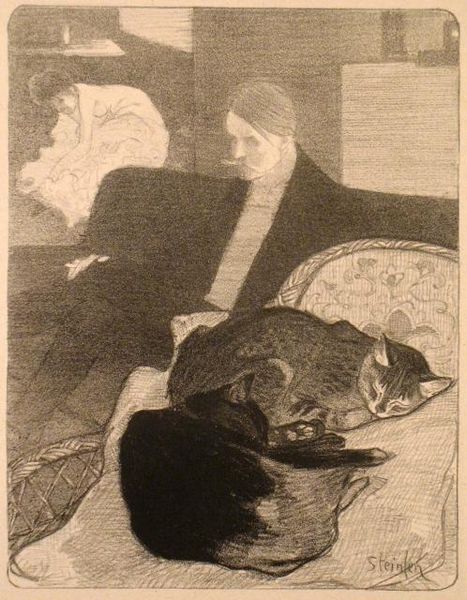 Editor: This is an illustration by Ethel Reed from "In Childhood's Country" by Louise Chandler Moulton, created in 1896. It's an ink drawing on paper and the texture really strikes me. The hatching is so deliberate. What do you see in this piece? Curator: I'm drawn to how Reed uses the materials, the ink and paper, to explore social context. The line work, almost obsessive in its detail, highlights the labor involved. Consider the Victorian era’s burgeoning market for illustrated books and prints. Was this piece produced to cater specifically to affluent women interested in motherhood and aestheticism? Editor: That's interesting! I hadn't considered the social implications of the material choice. The precise linework gives it this somewhat mass produced quality as well. It makes me think about reproducibility and distribution, reaching potentially wider audiences... Curator: Exactly! The use of ink, lends itself to printmaking, suggesting mass production and the commodification of childhood itself. And think about the intended audience – were they buying into an idealized vision of domesticity? Editor: Perhaps the cat points to a consumer item in many bourgeois families? A type of comfort, one could say... Curator: The cat is the most spontaneous element here and contrasts sharply with the highly stylized depiction of the child and that curious ornament dangling precariously by what appears to be a thread, so very separate and distinct. The cat points to the growing presence of animals that began to populate bourgeois households in Europe and the USA as family pets and members. This reinforces, in fact, this particular image and composition, by signaling that those familiar comforts are made possible, thanks to the proliferation of ink illustrations and the popularization of childhoods’ consumer market and values. What do you think of that contrast? Editor: That makes me see the illustration in a completely different light. Thank you! It's fascinating to think about the materials not just as artistic choices, but as a reflection of the social landscape. Curator: Indeed. It invites us to see how artistic production is embedded within broader economic and cultural forces. A view onto culture itself and childhood fantasies within this era!
